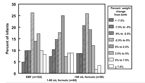 From the study: Distribution of weight changes from birth to day 7 of life according to formula supplementation category on day 3 (on left) and day 7 (on right).